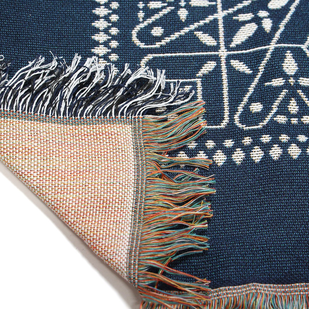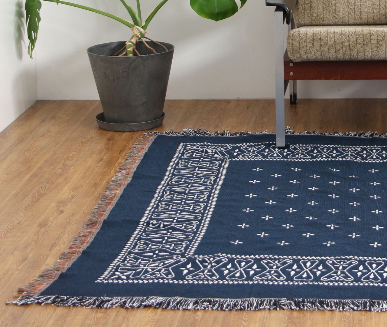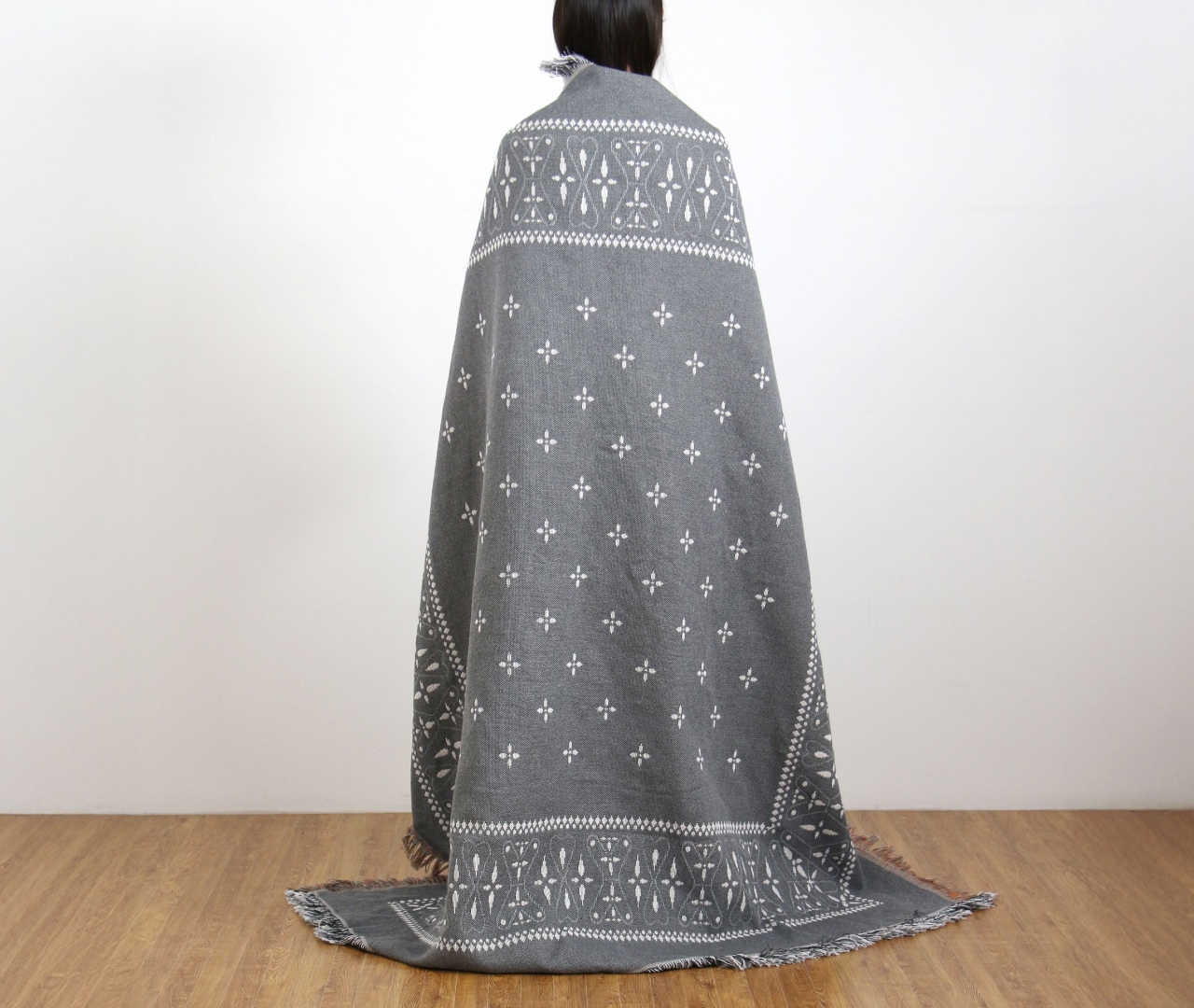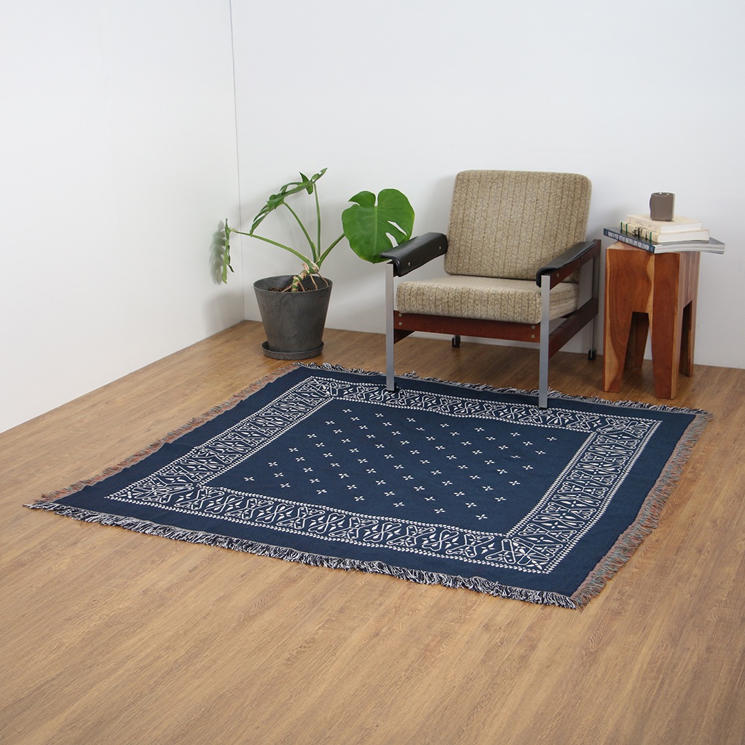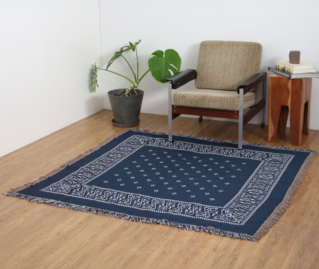 約150×150cmのゆとりあるサイズで、ブランケットとして羽織るほか、ソファやベッドカバー、ラグマット、テーブルクロス、タペストリーとしても活躍します。