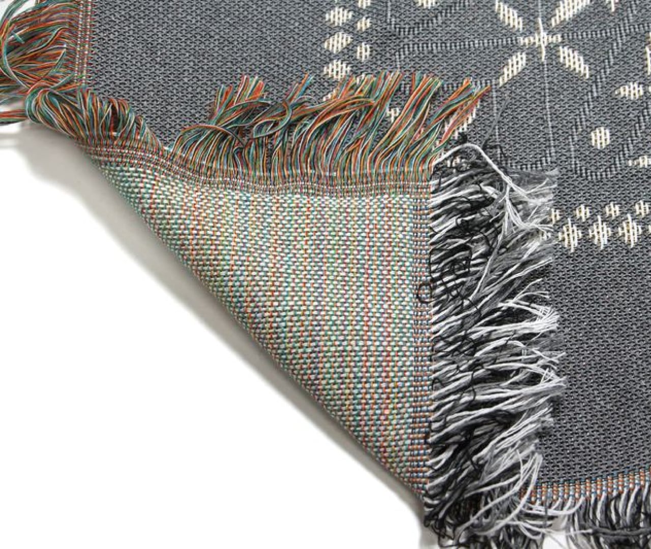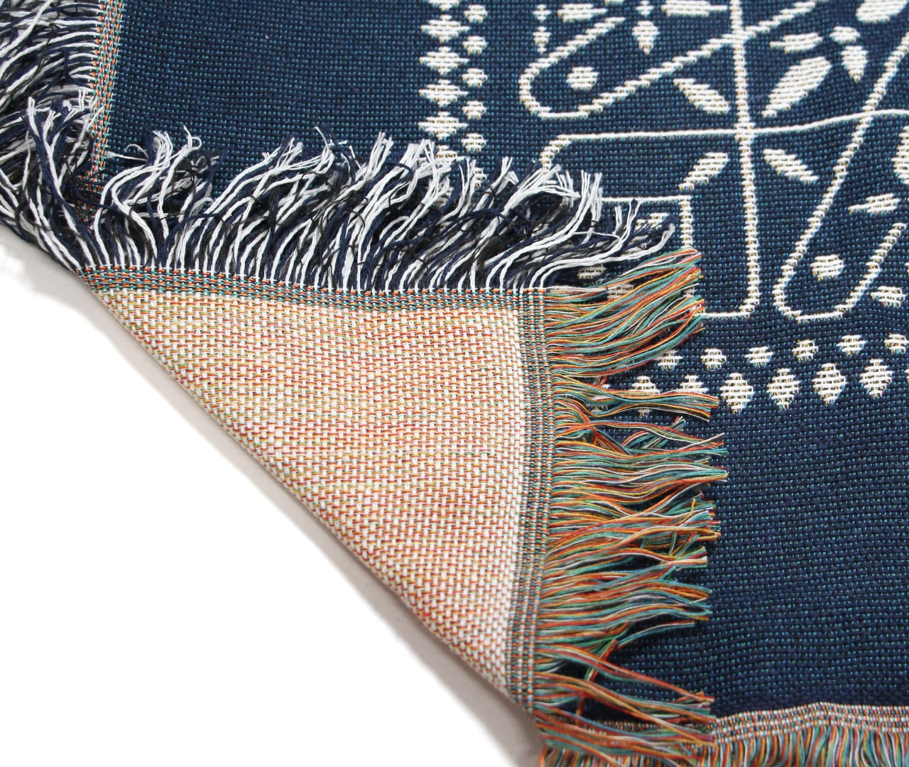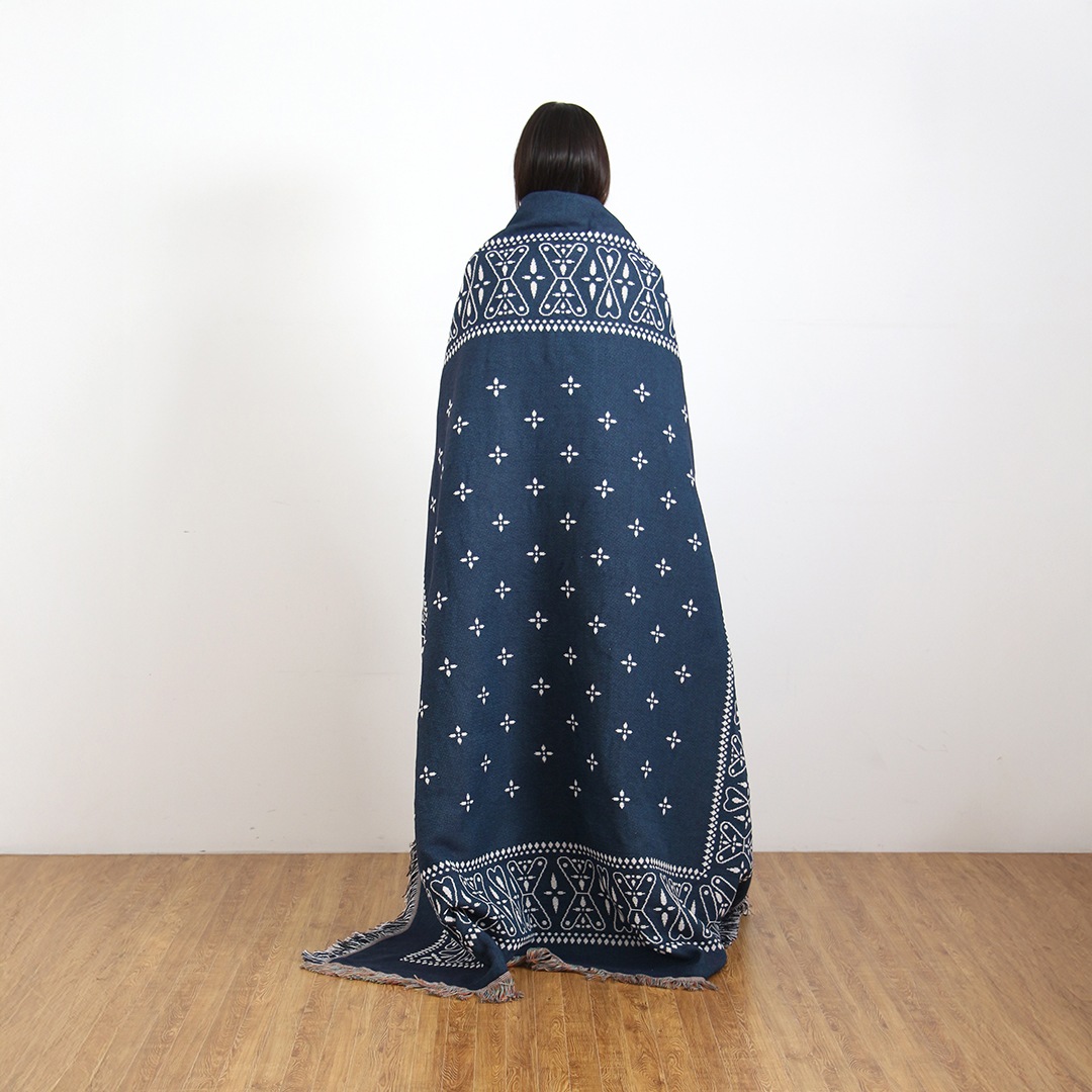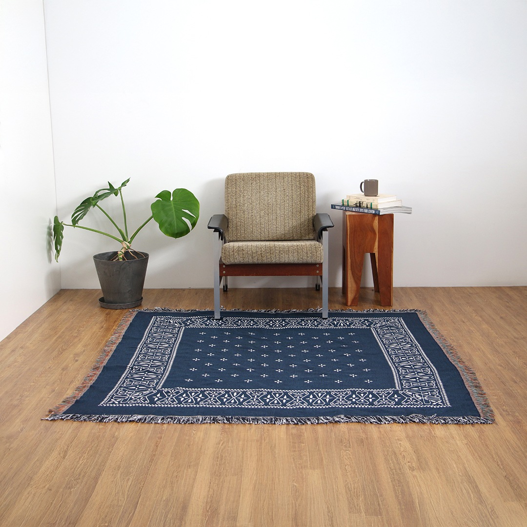 約150×150cmのゆとりあるサイズで、ブランケットとして羽織るほか、ソファやベッドカバー、ラグマット、テーブルクロス、タペストリーとしても活躍します。