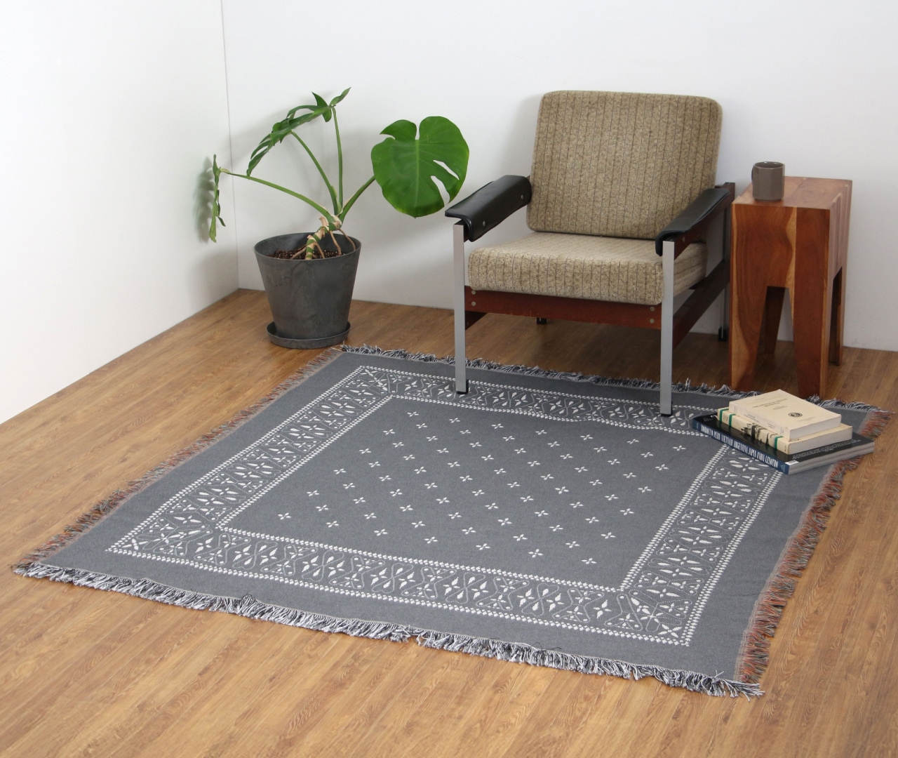 洗濯可能な素材でお手入れもしやすく、室内のインテリアはもちろん、ピクニックやビーチシートとして屋外でも使えるマルチユース仕様。
