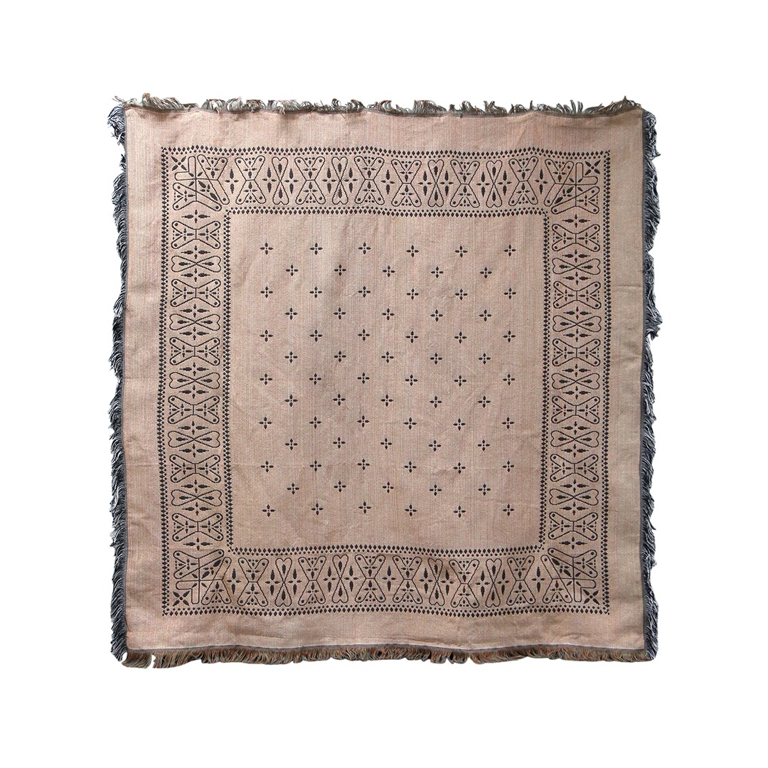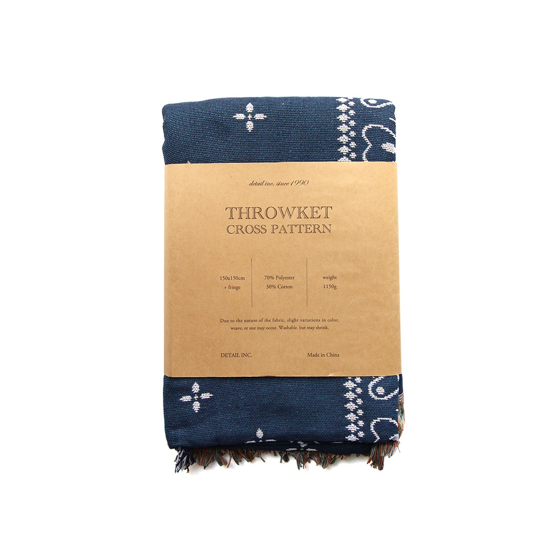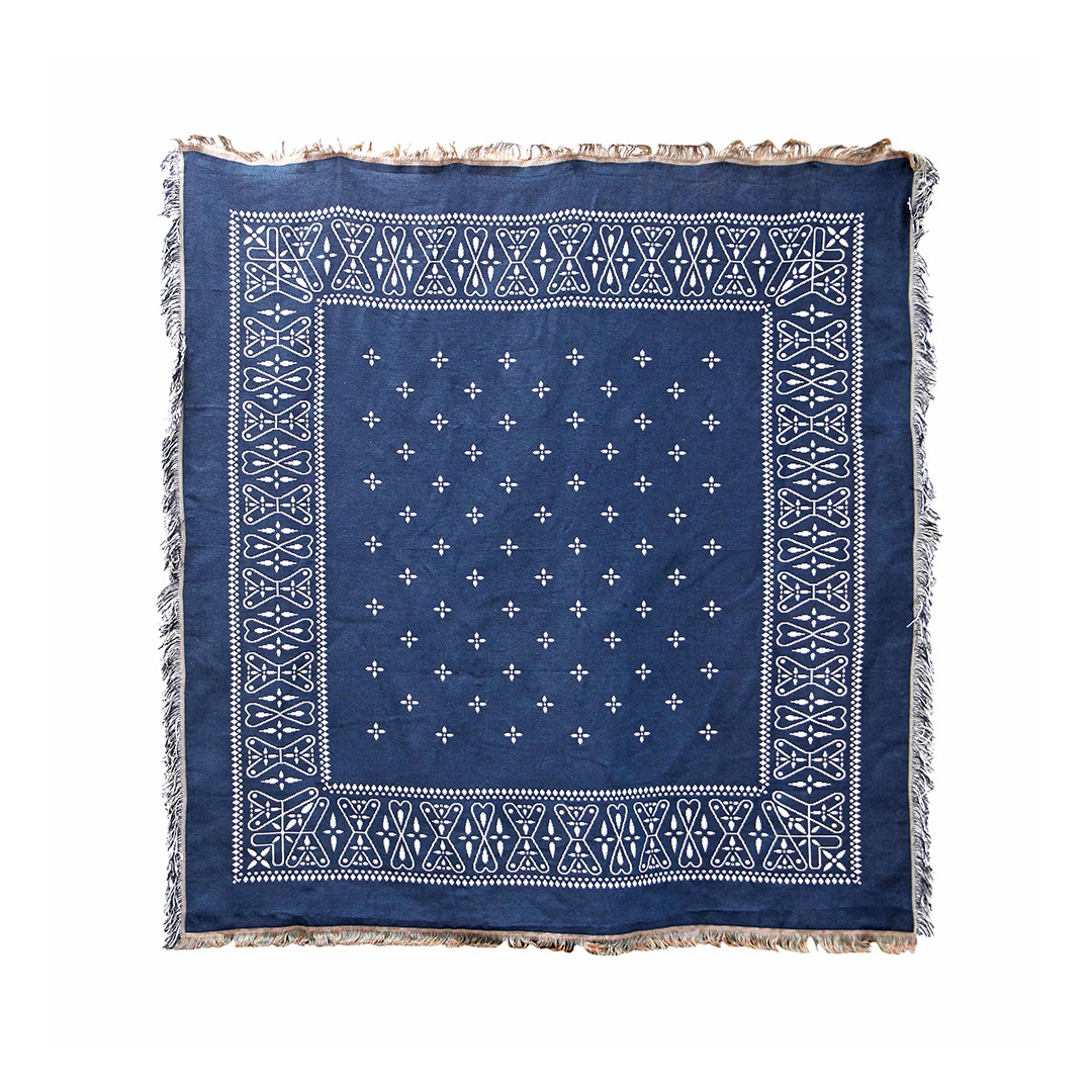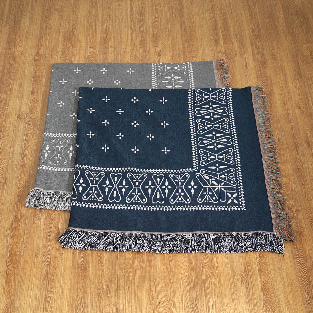 70〜80年代のバンダナに見られるクロス柄は、十字(クロス)が整然と並んだ幾何学模様が特徴。古着・アメカジ愛好家の間で非常に人気が高いパターンです。カラーはネイビーとグレーの2色展開。ネイビーはクロス柄の定番カラーとして空間を引き締め、グレーはやわらかく馴染みます。